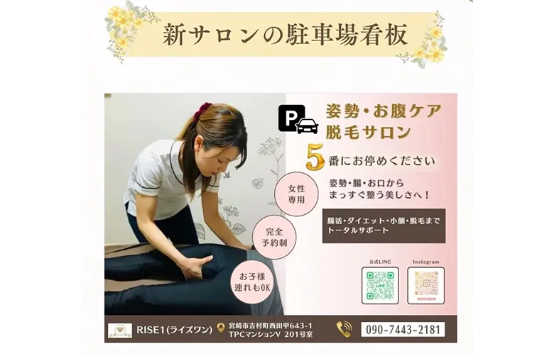 宮崎市にある完全予約制プライベートサロン《RISE1(ライズワン)》は、お腹・姿勢・肌を整える内側からの美を大切にしたトータルケアサロンです。